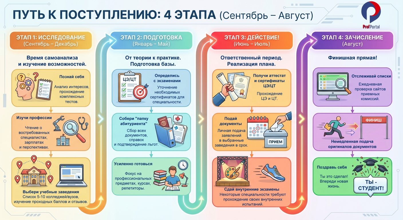 Поступление — это твой первый большой и серьезный проект. Кажется, что дел невпроворот? Без паники! Как и в любом проекте, здесь главное — четкий план. Мы подготовили для тебя пошаговый гид, который поможет пройти этот путь спокойно и уверенно.